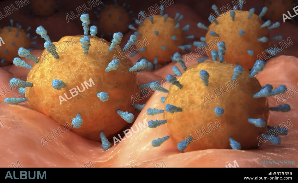 Conceptual biomedical illustration of rubeola measles virus on surface.