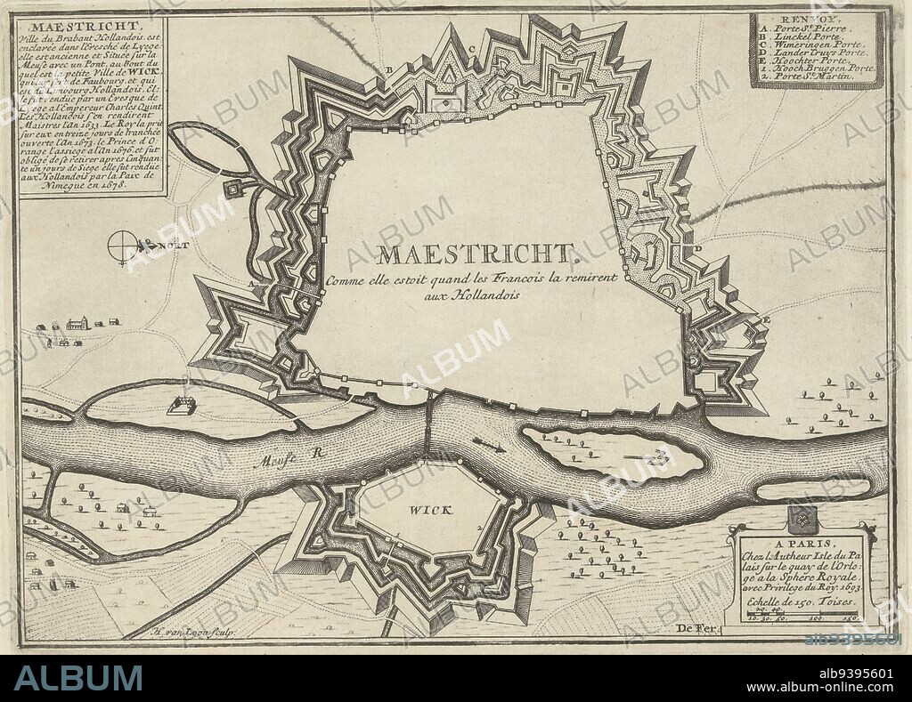 Map of the fortifications around Maastricht, besieged and captured by the French army, June 27-30, 1673. Top left a cartouche outlining the history of the city from 1633 to 1678. Top right the legend A-E and 1-2 in French, Map of Maastricht, 1673 Maestricht. Comme elle estoit quand les Francois la remirent aux Hollandois , print maker: Harmanus van Loon, (mentioned on object), publisher: unknown, Lodewijk XIV (koning van Frankrijk), (mentioned on object), Paris, 1693, paper, etching, h 200 mm × w 275 mm