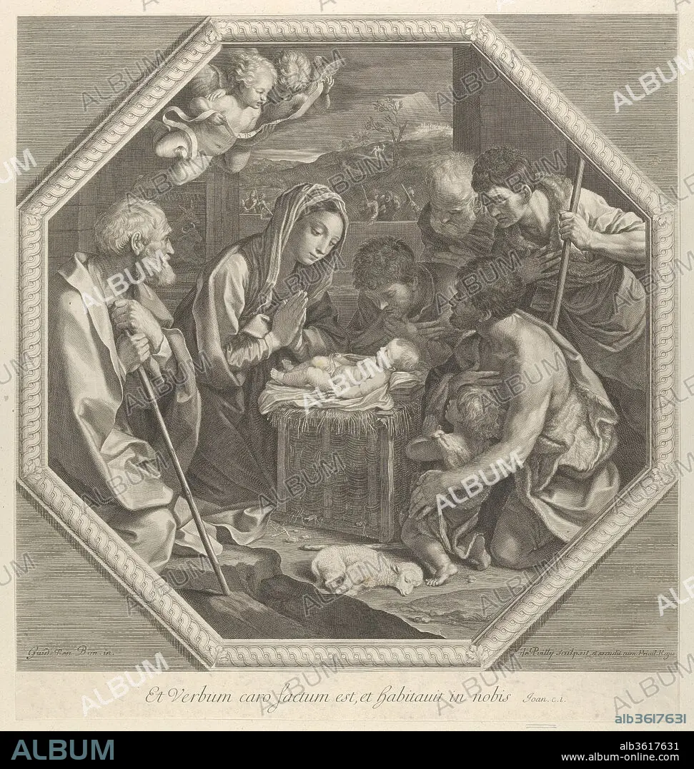 Caption: The adoration of the shepherds who kneel together at right before the infant Christ, the Virgin and Saint Joseph at left, two angels above, in an octagonal frame, after Reni. Artist: After Guido Reni (Italian, Bologna 1575-1642 Bologna). Artist and publisher: Francois de Poilly (French, Abbeville 1623-1693 Paris). Dimensions: Sheet (Trimmed): 16 7/8 × 15 13/16 in. (42.8 × 40.1 cm). Date: ca. 1655-93.