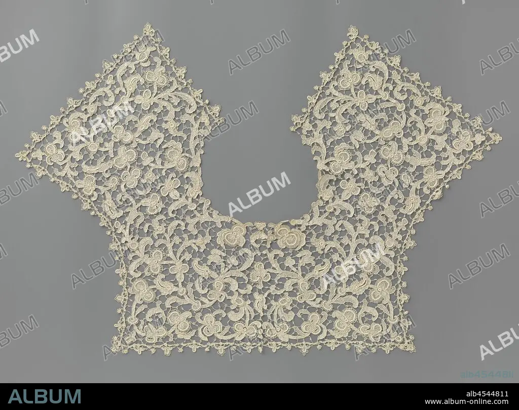 Square collar with rebate shape, Collar of natural-colored needle lace: Venetian rose lace. Square model with rebate shape. Against an open bar of ground stand symmetrical feathered leaf vines on tendrils, on which furthermore mainly triple-leaf palmetal flowers, which have doubled and tripled arched edges. Rondon a faintly scalloped leaf border of roses and palms., anonymous, Belgium (possibly), c. 1890, cotton (textile), Venetian rose point, w 17.5 cm × w 67 cm c 41 cm