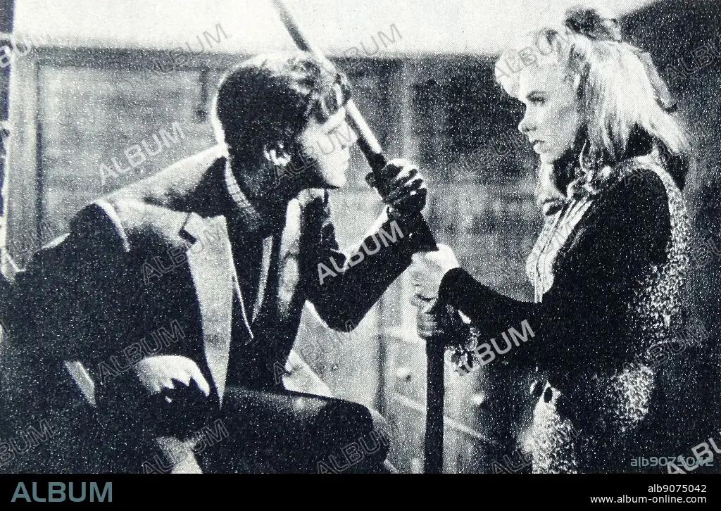 Caption: Newspaper review of the The Mind Benders, a 1963 British thriller film, photograph of Dirk Bogarde and Wendy Craig.