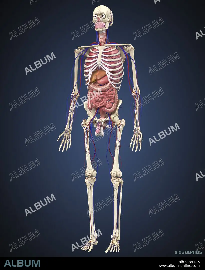 Human skeleton with organs and circulatory system.
