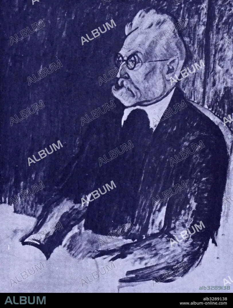 Caption: Sketched portrait of Miguel de Unamuno (1864-1936) a Spanish essayist, novelist, poet, playwright, philosopher and professor of Greek and Classics. Dated 20th Century.