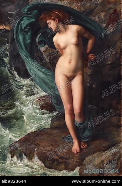 Andromeda; in Greek mythology the wife of Perseus and the daughter of the Ethiopian king Cepheus. To atone for her mother's hubris; Andromeda is to be offered as a human sacrifice to a sea monster of Poseidon and is chained to a rock; Painting by Edward John Poynter; Historical; digitally restored reproduction from a 19th century original