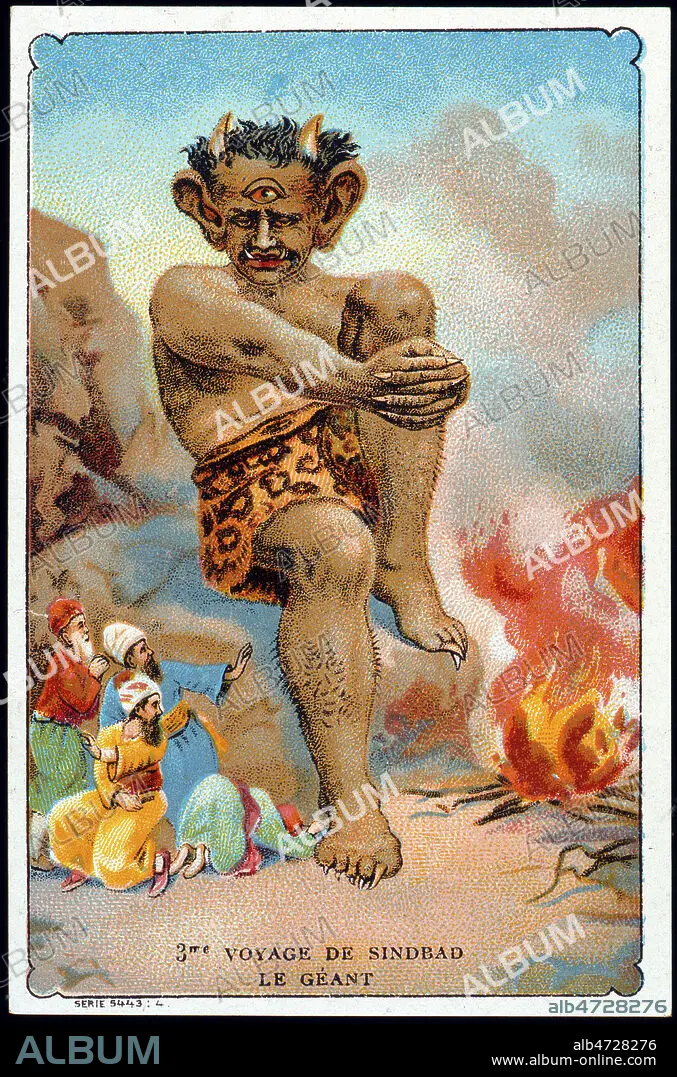 Troisieme voyage de Sinbad le marin. Le geant. Illustratyion anonyme pour un chromo vers 1910. Credit : Collection KHARBINE-TAPABOR.