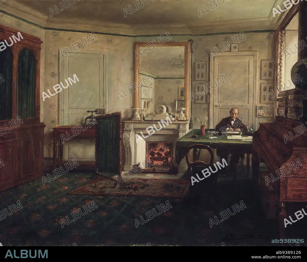 The Office of Don Manuel Romero de Terreros in Paris, Gabinete de Don Manuel Romero de Terreros en París, José María Calderón, Mexican, 1823-1876, Oil on canvas, France, 1870, 25 1/2 x 31 3/4 in., 64.8 x 80.6 cm, darn, desk, door, embers, fire screen, fireplace, man, mirror, office, painting, room, seated, window, work, writing
