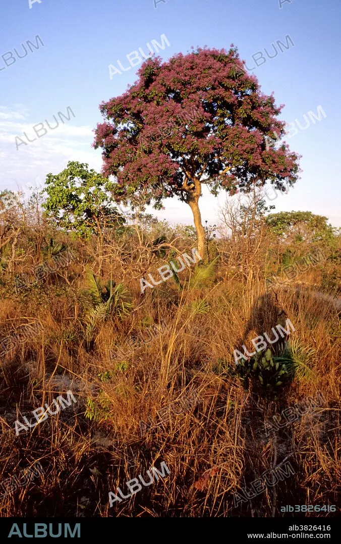 The Sucupira-Branca tree (Pterodon polygalaeflorus), a medicinal plant, flowering among other vegetation in Grande Sertao Veredas National Park, Chapada Gaucha, Brazil.
