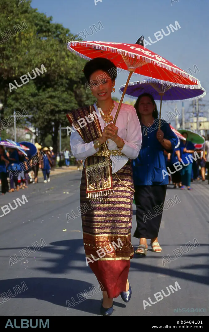 Title: Khon Muang (Northern Thai) woman parading in her finery, Chiang Mai Flower Festival Parade, Chiang Mai, northern Thailand.