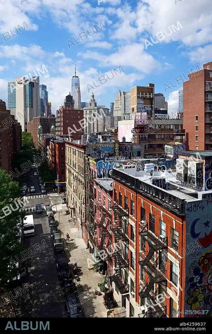 View from Manhattan Bridge to Madison Street, Chinatown and Graffitis on the Roofs, New York City, USA, North America