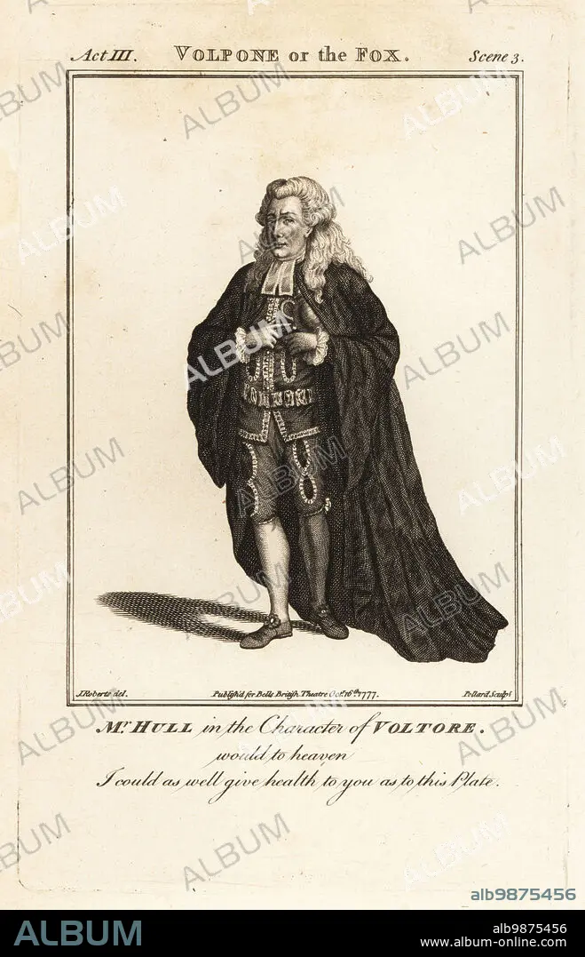 Caption: Mr. Thomas Hull in the character of Voltore in Ben Jonsons Volpone, Covent Garden Theatre, 1771. Thomas Hull was an English actor and dramatist, 17281808. Copperplate engraving by R. Pollard after an illustration by James Roberts from Bells British Theatre, Consisting of the most esteemed English Plays, John Bell, London, 1777.