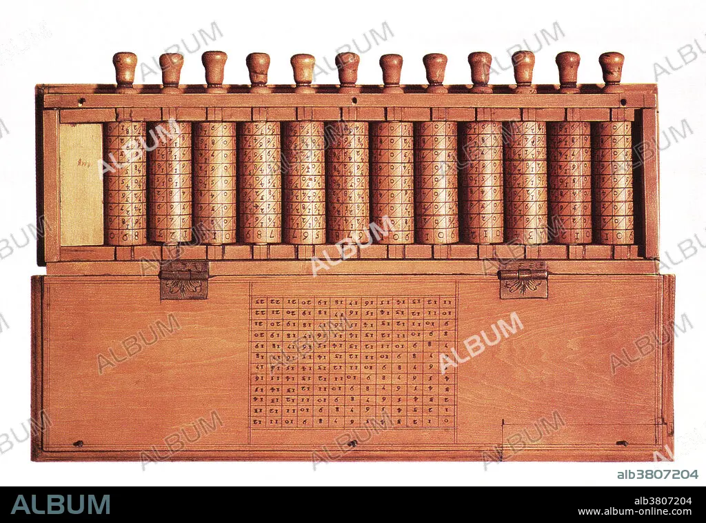 Caption: Napier's bones, an early calculating machine designed by John Napier which converted multiplication problems into a sequence of simple addition.