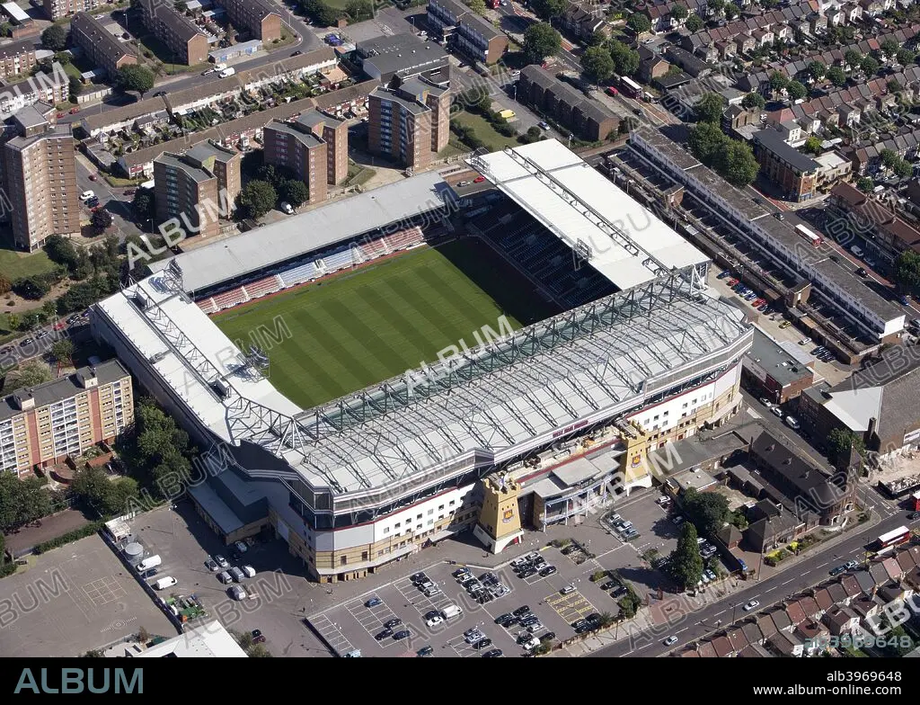 Caption: Upton Park football ground, London, 2009. Aerial view of the Boleyn Ground, the home of West Ham United FC since 1904.