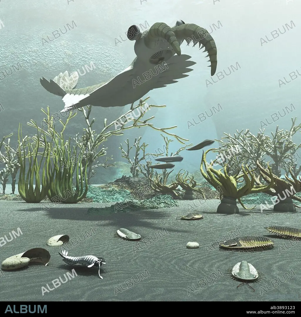 Animals and floral life from the Cambrian period about 500 million years ago from the Burgess Shale formation in Canada. Visible are Anomalocaris, Opabinia, trilobites, stromatolites, and anemones.