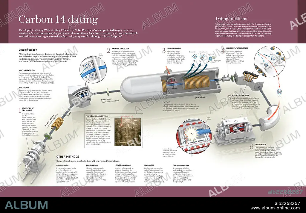 Caption: Infographic about the dating method with Carbon 14, very useful to date organic remains of up to 60,000 years old.