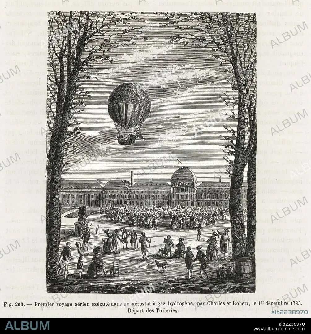 First manned flight in a hydrogen gas balloon by Professor Jacques Charles and the Robert brothers, Anne-Jean and Nicolas-Louis, from the Tuileries, December 1783. Woodblock engraving from Louis Figuier's "Les Merveilles de la Science: Aerostats" (Marvels of Science: Air Balloons), Furne, Jouvet et Cie, Paris, 1868.