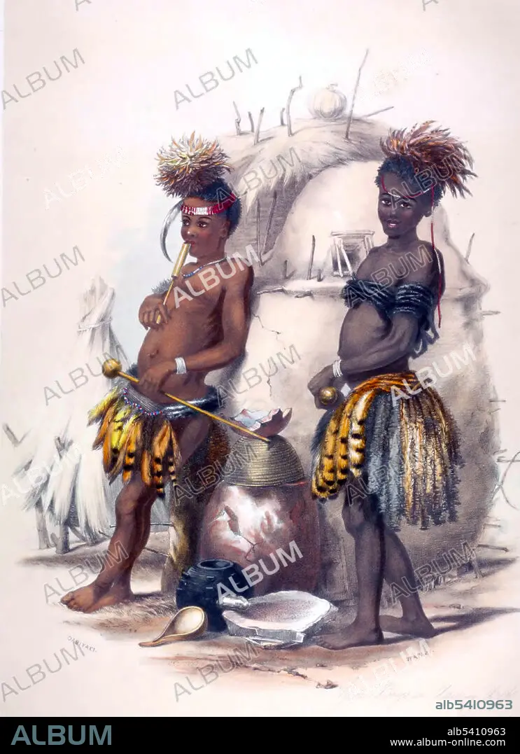Dabiyaki and Upapazi, Zulu boys in their dance costumes. In a typical Zulu dance large and high steps and jumps are made, and is hard and rhythmically pounded on the ground. The dancers stand in a line. Hands are piled high, often decorated with weapons and shields. George French Angas (April 25, 1822 - October 4, 1886) was an English explorer and painter. In 1846 Angas went to South Africa, where he spent two years in Natal and the Cape, working on a series of drawings and watercolors which were published in 1849 as The Kafirs Illustrated.