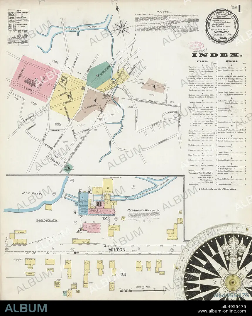 Image 1 of Sanborn Fire Insurance Map from Dedham, Norfolk County, Massachusetts. Sep 1892. 6 Sheet(s), America, street map with a Nineteenth Century compass.