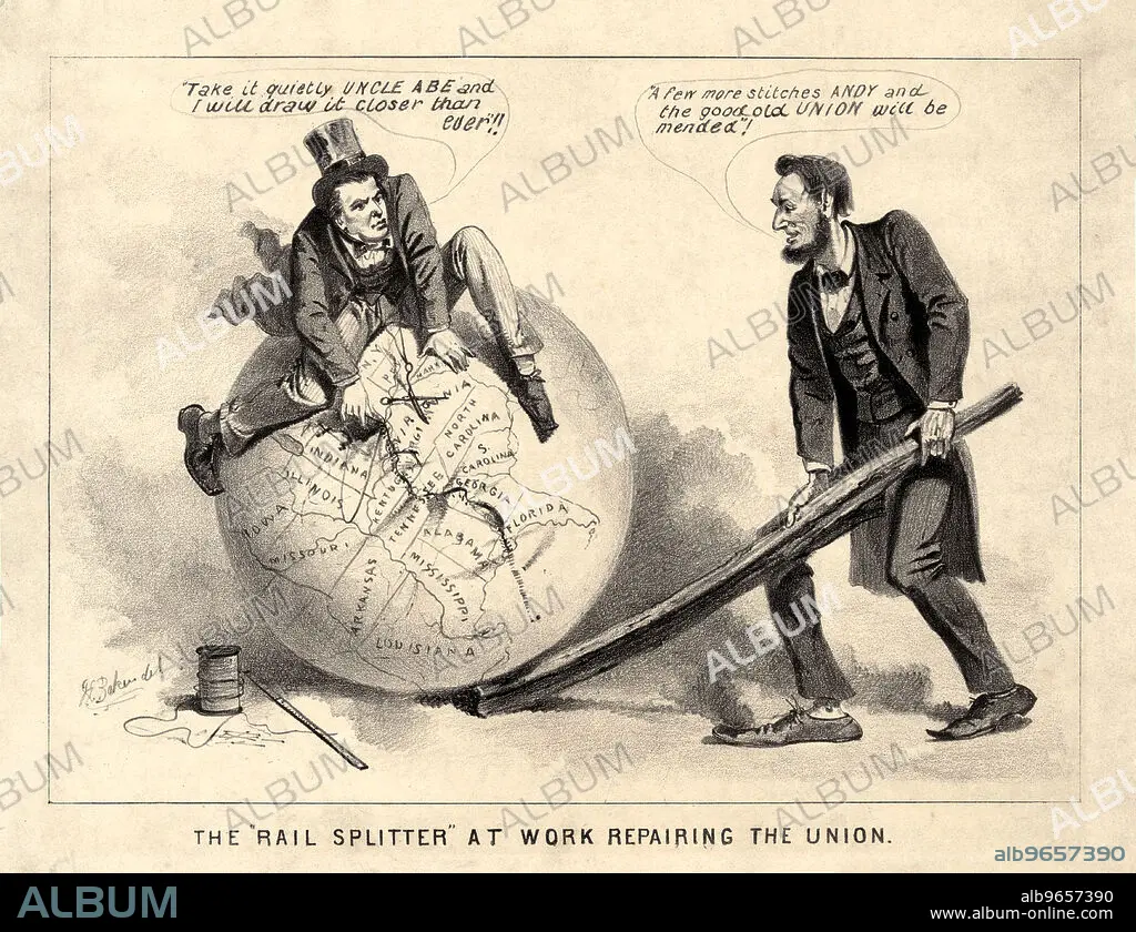 Caption: The "Rail Splitter" at Work Repairing the Union", Political Cartoon Featuring U.S. President Abraham Lincoln and Vice President Andrew Johnson, Joseph E. Baker, 1865