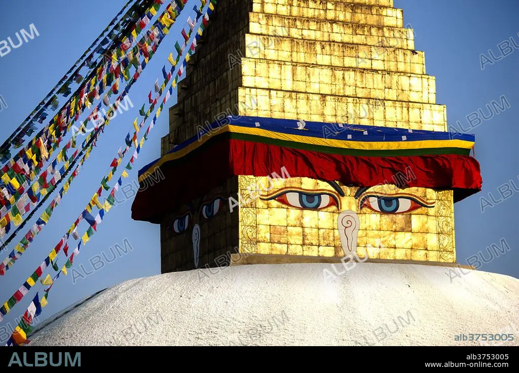 Caption: Close-up of Bodhnath Stupa (Boudhanth) (Boudha), one of the holiest Buddhist sites in Kathmandu, UNESCO World Heritage Site, with the gold plating glowing in the evening sunlight, Kathmandu, Nepal, Asia