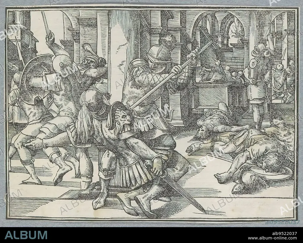 Caption: Warrior man killed with spear, Mattathias pierces a Jew, In a temple a fight is going on and a man is pierced with a spear. The depiction includes the priest Mattatias killing a man who wanted to make a sacrifice on the altar in Modein in accordance with the king's command. The print is part of an album., print maker: Christoffel van Sichem (I), after design by: Tobias Stimmer, Amsterdam, 1574, paper, letterpress printing, height 109 mm × width 149 mm