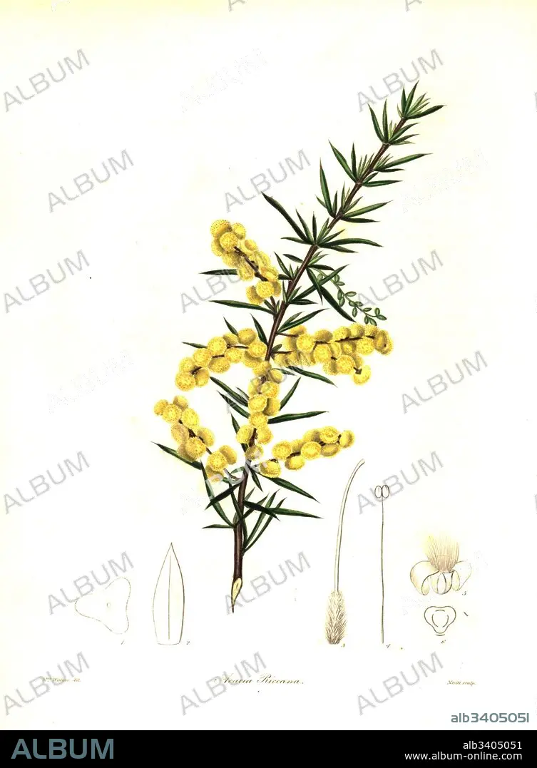 Caption: Rice's wattle or Mr. T. Spring Rice's acacia, Acacia riceana. Handcoloured copperplate engraving by S. Nevitt after a botanical illustration by Mrs Augusta Withers from Benjamin Maund and the Rev. John Stevens Henslow's The Botanist, London, 1836.