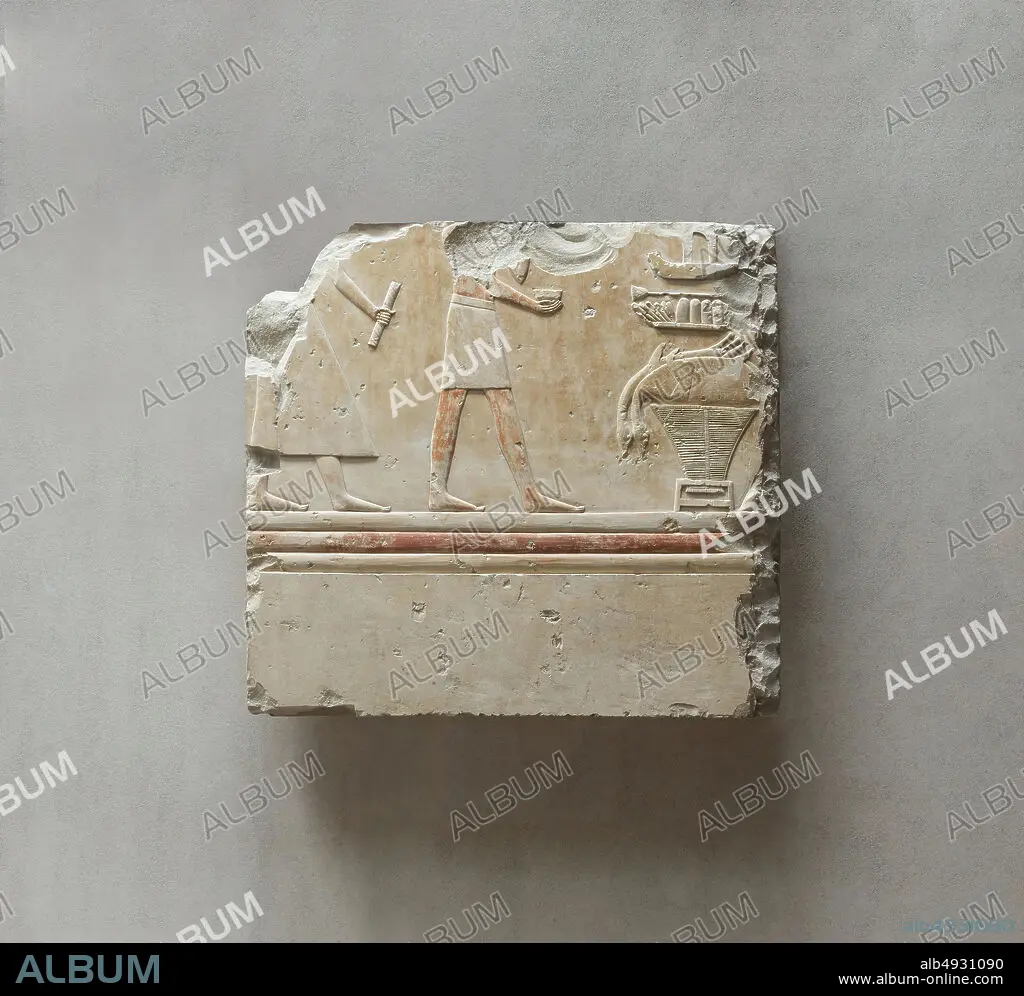 Caption: Relief from the tomb of Queen Neferu: a scribe and a cupbearer approach the queen's offering table, Middle Kingdom, Dynasty 11, reign of Mentuhotep II, early, ca. 20512030 B.C., From Egypt, Upper Egypt, Thebes, Deir el-Bahri, Tomb of Neferu, 192325, Limestone, paint, H. 51.5 x W. 55 cm (20 1/4 x 21 5/8 in.)