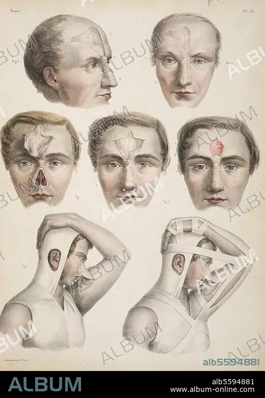 Caption: Medicine / Plastic Surgery. "Rhinoplastique". (Artificial nose created from the skin of the forehead and the upper arm). Col. lithograph after drawing by Nicolas Henri Jacob (1782-1871). From: M.J. Bourgery, Traité complet de l'anatomie de l'homme, 1831-54, vol. 7, pl. 14. Private Collection.