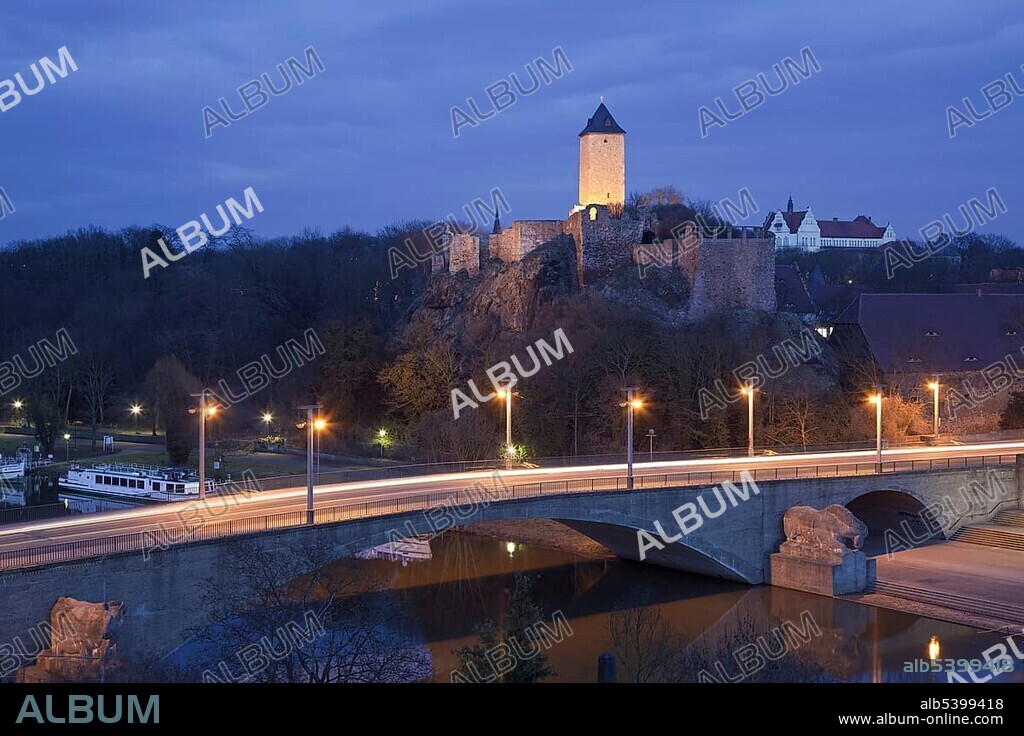 View of bridge and Burg Giebichenstein castle illuminated at night, River Saale, Halle, Saxony-Anhalt, Germany, Europe