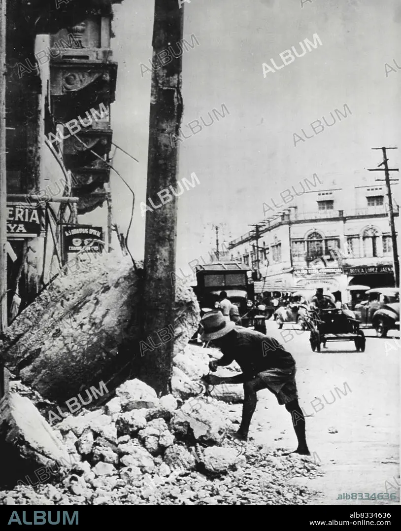 Caption: Quake Brings More Destruction - Rubble once again litters streets of Iloilo, Panay, P.I. after an earthquake Jan. 25, which took 27 lives. The city's business district was 90 percent destroyed during the war and was just reaching recovery when disaster struck again. Here a workman retrieves a broken telephone line from debris. January 29, 1948. (Photo by AP Wirephoto).