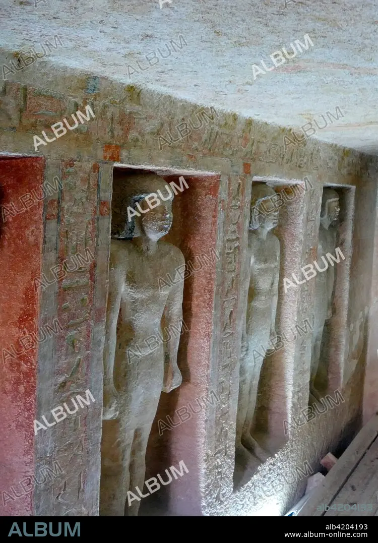 Caption: niche containing a high-relief statue of Idu. From the Tomb of Idu. in the Giza Necropolis. Cairo. Egypt. G7102 or Idu's Mastaba lies to the east of Queen Hetepheres pyramid in the Great Pyramid complex. He was an official of the sixth dynasty. probably during the reign of Pepi I. He held the titles "Scribe of the Royal Documents". Pepi I Meryre (reigned 2332 – 2287 BC) as the third king of the Sixth dynasty of Egypt