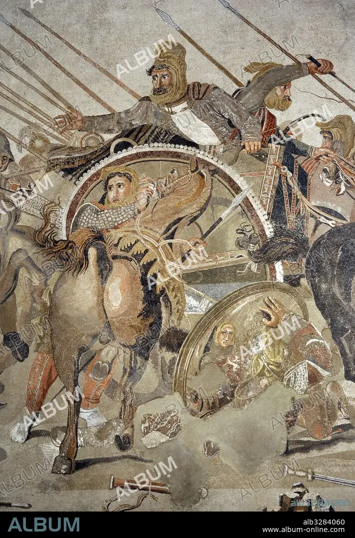 Alexander Mosaic. Battle of Issus (333 B.C.). Battle between Alexander the Great and the Achaemenid Empire, Darius III. Mosaic. Pompei, Casa del Fauno (VI, 12, 2). 2nd century AD. Detail. Darius III (380-330 BC). National Archaeological Museum, Naples. Italy.