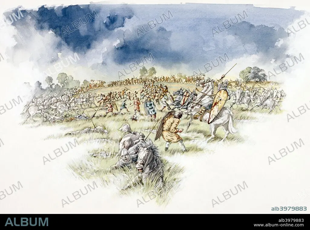 Caption: Battle of Hastings, 1066 (c1990-2010). Reconstruction drawing showing the Normans counter-attacking English Fyrdmen cut off on a hillock.