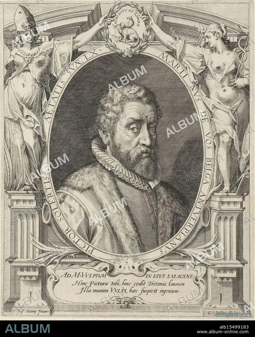 Caption: Heintz, Joseph (I), Vos, Maerten de, Rome, Sadeler, Aegidius, Portrait of Maerten de Vos at the age of 60, verso - stamped, Portrait of the Antwerp painter and draughtsman Maerten de Vos, at the age of 60. Two allegorical female figures (Rhetoric (r.) and Minerva (l)) hold a laurel wreath above the portrait. In the laurel wreath an emblem of a bird sitting on a fox., print, prints, height 288 mm, width 231 mm, South Netherlands, 1570 - 1629, print maker, printmaker, 1592 - 1592, paper, engraving, engraving (printing process), 1532 - 1603-12-04, after, after painting by, Work conception, 1564-06-15 - 1609-10-15