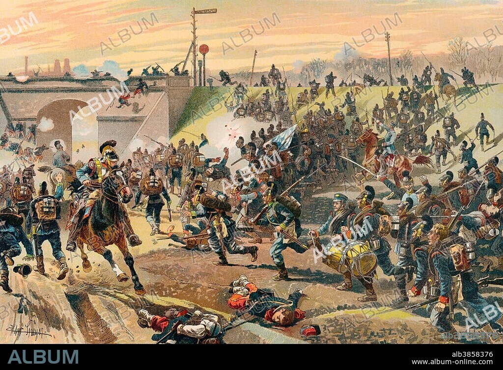 Caption: Storming of the railway embankment outside Orleans by the First Bavarian Corps on 11 October 1870, Franco-Prussian War or Franco-German War, 1870-1871, between the French Empire and the Kingdom of Prussia