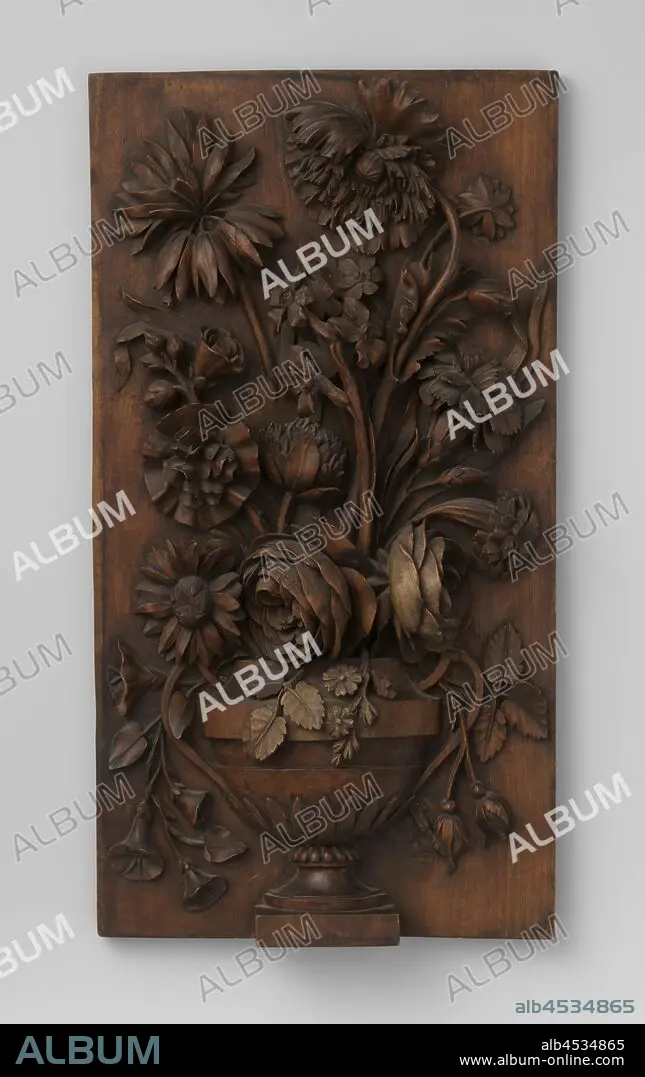 Furniture fragment with flower vase carved in high relief, Panel of walnut carved in high relief, flower vase, urn shape with two ears, with flowers., c. 1450 - c. 1950, walnut (hardwood), h 50 cm × w 26.5 cm × d 5 cm