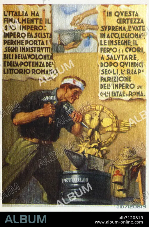 Caption: FASCISM Postcard of propaganda. The phrases in the cartigli are drawn by the speech of Mussolini of 9 May 1936 for Proclamation of the Empire, to the term of the war of Ethiopia:'Italy has its Empire finally: Fascist empire... ... in this supreme certainty up legionari rises, the standards, the iron, and the hearts to greeting...'Illustration of Manlio D' Ercoli, 1936