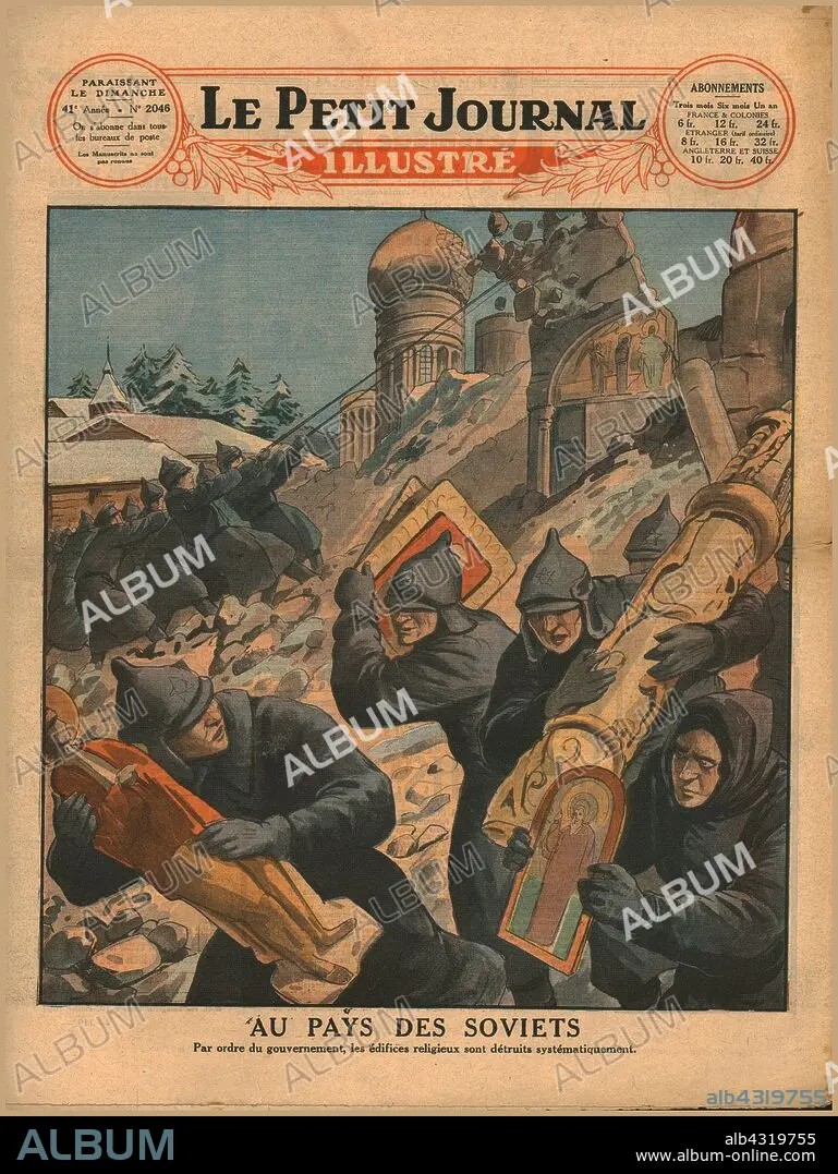 Caption: In the land of the Soviets, 1930. 'Au Pays Des Soviets'. 'By order of the government, religious buildings are systematically destroyed'. The Soviet Union actively destroyed religious sites including Russian Orthodox churches and Jewish cemeteries. This was to discourage religious practice and curb the activities of religious groups. Back cover of "Le Petit Journal Illustré". [France, 9 March 1930]
