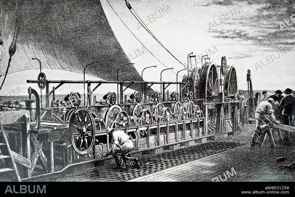 Caption: Print depicting the transportation of the cables used in the Atlantic Telegraph. The transatlantic telegraph cable was an undersea cable running under the Atlantic Ocean used for telegraph communications. Transatlantic telegraph cables have since been replaced by transatlantic telecommunications cables. Dated 19th century