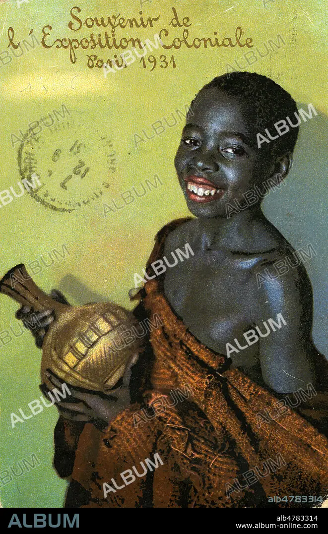 'Souvenir de l'Exposition Coloniale Paris 1931' : enfant africain portant une cruche. Photographie anonyme pour une carte postale. Credit : Collection IM/KHARBINE-TAPABOR.