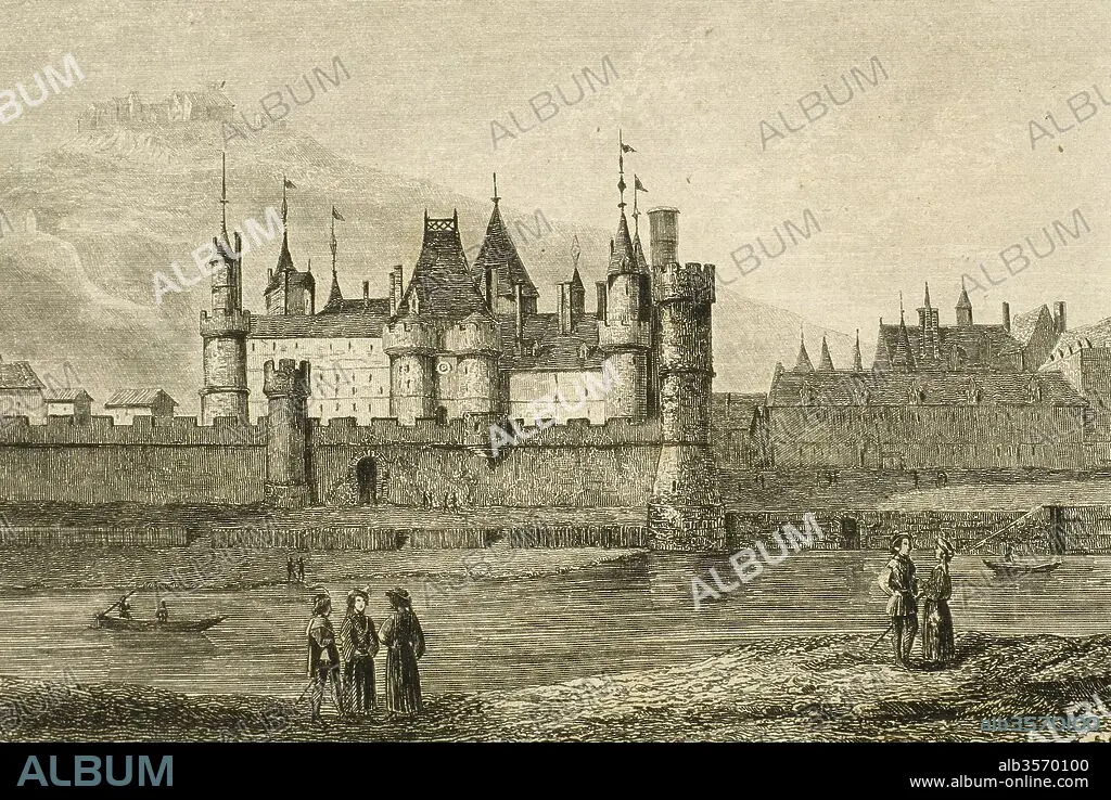 Automatic translation: Paris France. Louvre Palace. Scene during the reign (1364-1380) of King Charles V "the Wise" (1338-1380). Drawing by Gaucherel. Engraving, 1841. "Universal Panorama-France"