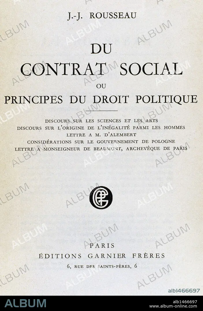 ROUSSEAU, Jean Jacques (1712-1778). Escritor y filósofo en lengua francesa. Portada del "CONTRATO SOCIAL" (1762), tratado político en favor de la democracia.