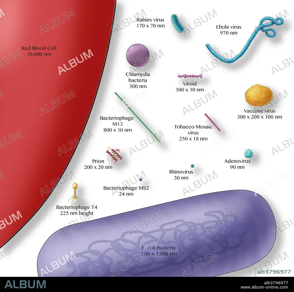 Illustration showing the relative sizes of a red blood cell (left), bacteria (purple, bottom) and various viruses.