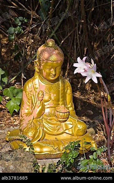Buddha statue made of stone in garden with lillies, Algarve, Portugal, Europe