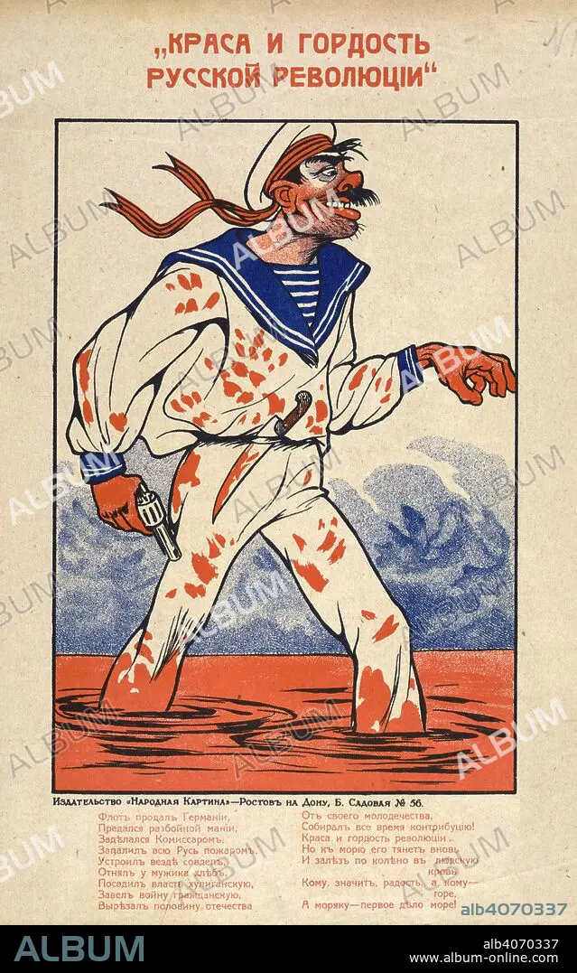 «КраÑа и гордоÑть руÑÑкой революции» “The pride and glory of the Russian Revolution†Depicts a Red sailor clutching a revolver and a blood-stained knife and wading through a sea of blood. [A collection of posters issued by the Southern anti-Bolshevik armies.]. [1918-21]. Source: 1856.g.8.(18). Language: Russian.