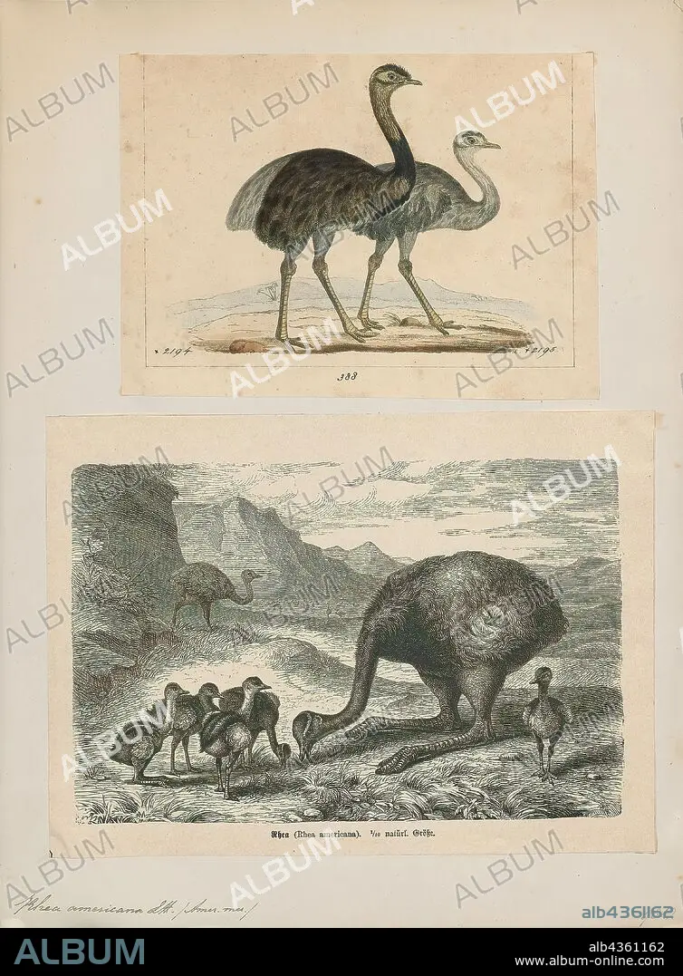 Rhea americana, Print, The greater rhea (Rhea americana) is a species of flightless bird native to eastern South America. Other names for the greater rhea include the grey, common, or American rhea; ñandú (Guaraní and Spanish); or ema (Portuguese). One of two species in the genus Rhea, in the family Rheidae, the greater rhea is native to Argentina, Bolivia, Brazil, Paraguay and Uruguay. It inhabits a variety of open areas, such as grasslands, savanna or grassy wetlands. Weighing 20–27 kilograms (44–60 lb), the greater rhea is the largest bird in South America. In the wild, the greater rhea has a life expectancy of 10.5 years. It is also notable for its reproductive habits, and for the fact that a population has established itself in Northern Germany in recent years. The species is listed as Near Threatened by the IUCN., 1700-1880