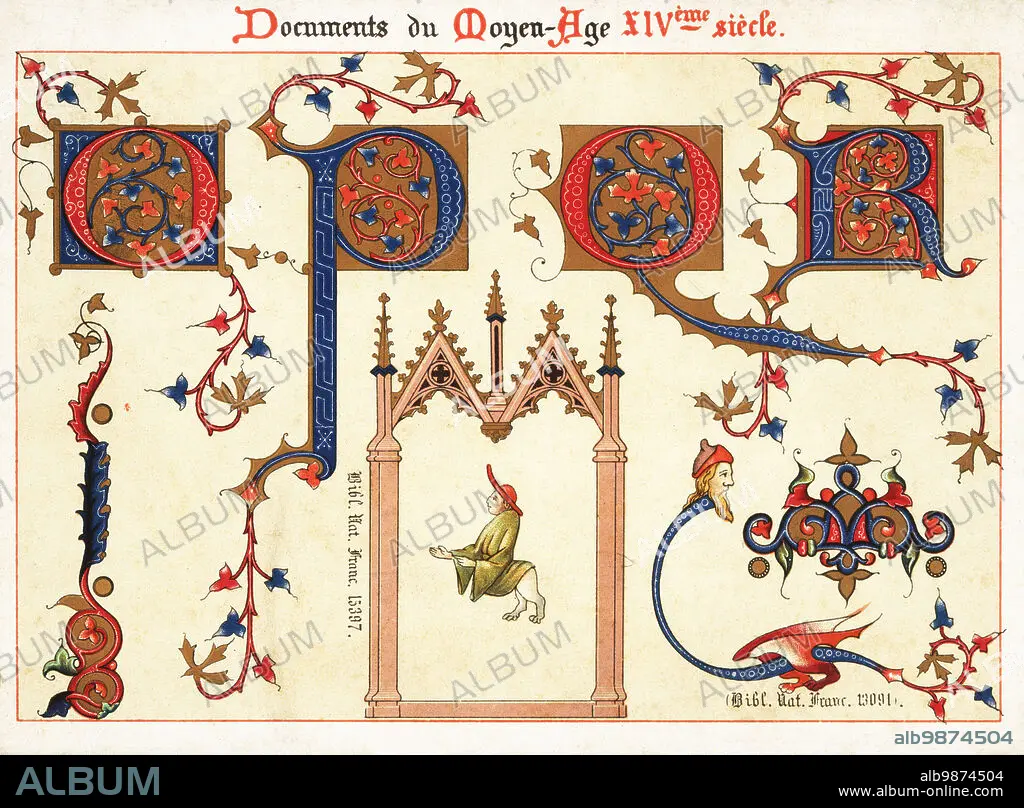 Initial letters OPQR from Jean de Sy's illuminated Bible for King Jean II of France, Jean le Bon, and elements and monsters from the Psalter of Jean de Berry, 14th century. Bibl. Nat. Francais 15397, Bibl. Nat. Franc. 13091. Chromolithograph designed and lithographed by Ernst Guillot from his Ornementation des Manuscrits au Moyen-Age (Ornamentation from Manuscripts of the Middle Ages), Paris, 1897.