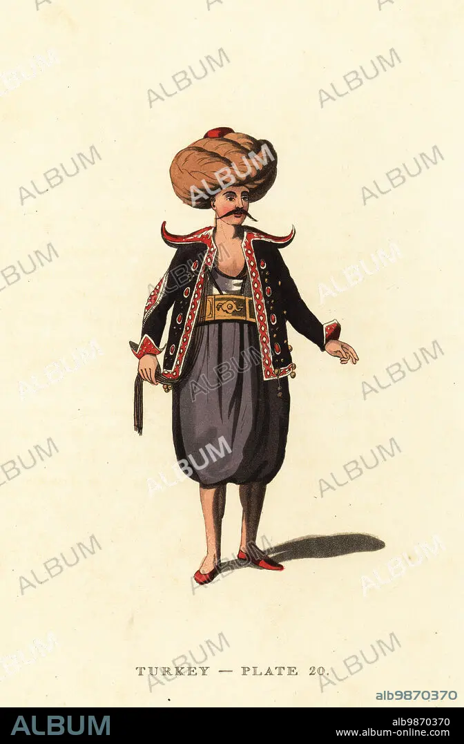 Caption: Saka or Turkish water carrier of Pera, Constantinople. He wears a large turban, short jacket decorated with gold or silk twist, loose trousers and red slippers. Handcoloured copperplate engraving after Octavian Dalvimart from William Alexanders translation of Picturesque Representations of the Dress and Manners of the Turks, Thomas MLean, London, 1814.