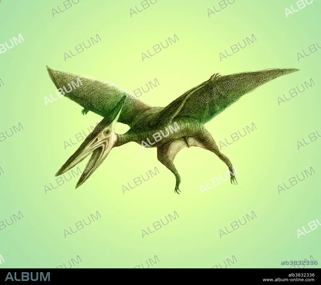 Caption: Pteranodon pterosaur (also Pterodactyl), artwork. Pteranodon was a flying reptile that inhabited what is now North America and Europe during the late Cretaceous period, between 85 and 75 million years ago. It was carnivorous, and probably fed on fish, which it caught from the water in its toothless bill. Its wingspan could reach up to ten meters.