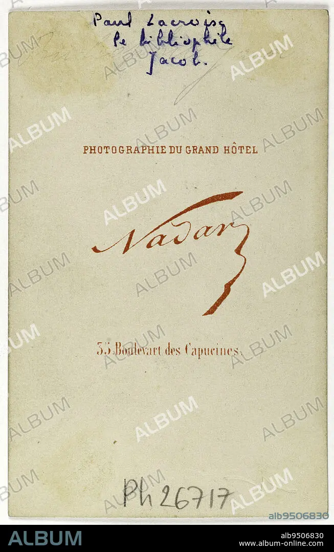 Caption: Portrait of Lacroix Paul, (known as Le Bibliophile Jacob), (1806-1884), (literary, scholar, curator of the Arsenal library), Atelier Nadar, Photographer, Between 1860 and 1890, 2nd half of the 19th century, Photography, Graphic arts, Photography, Albumen paper print, Dimensions - Work: Height: 8.9 cm, Width: 5.5 cm, Dimensions: Height: 10.3 cm, Width: 6.5 cm