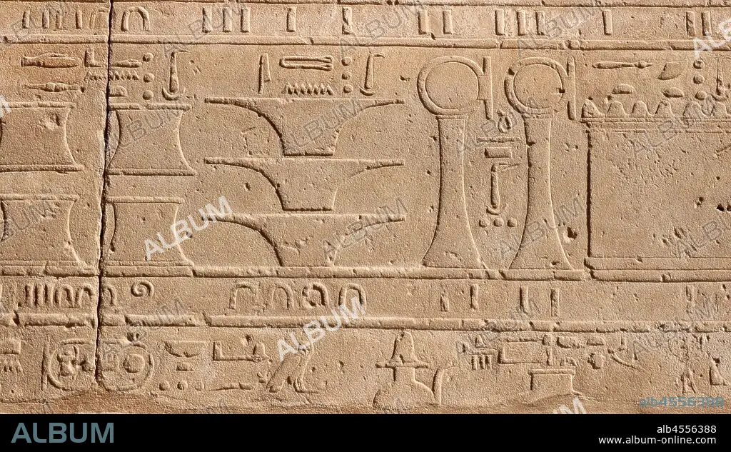Caption: A photograph taken of the Festival Hall of Thutmose III (Akh-menu) is an ancient shrine in Luxor (Thebes), Egypt. It is located at the heart of the Precinct of Amun-Re, in the Karnak Temple Complex. The Hall is situated at the end of the Middle Kingdom court. It was initially built to celebrate the Jubilee (Heb-Sed) of the 18th dynasty Pharaoh, Thutmose III, and later became used as part of the annual Opet Festival. circa 1425 BC.